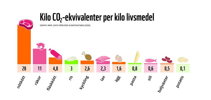 • Ät vegetariskt eller veganskt. Pasta, baljväxter (bl.a. bönor, linser, ärtor) och potatis har en mycket lägre klimatpåverkan jämfört med kött, fisk och ägg. Välj hellre potatis eller pasta istället för ris, vilket har stor klimatpåverkan på grund av dess metanutsläpp från odlingen och långa transport.