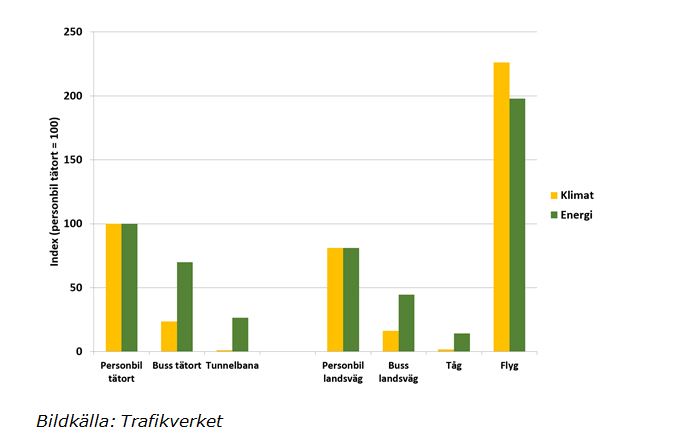• Övriga deltagare rekommenderas att åka med kollektivtrafik till platsen för aktiviteten. Utsläppen från och energiförbrukningen av buss och ex tunnelbana är mycket lägre än de från en personbil, se grafiken nedan.